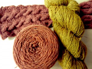 Merci – a perfect cotton, silk and merino mixture I wanted to use in my book but it was discontinued quickly due to lack of demand, unfortunately – in orange and purple, see below. Merci has a fabulous stitch definition and knits on a 4mm/US 6.