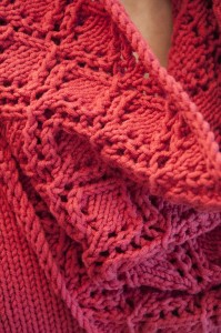 Amoretto – the alpaca and cotton mixture in beautiful colours – in a soft melange pink. See photo above and see photo of Japanese Lace Jacket from my book knitted in cream using a 3mm/US 2.5 shown in my post: sneak-peak-2.