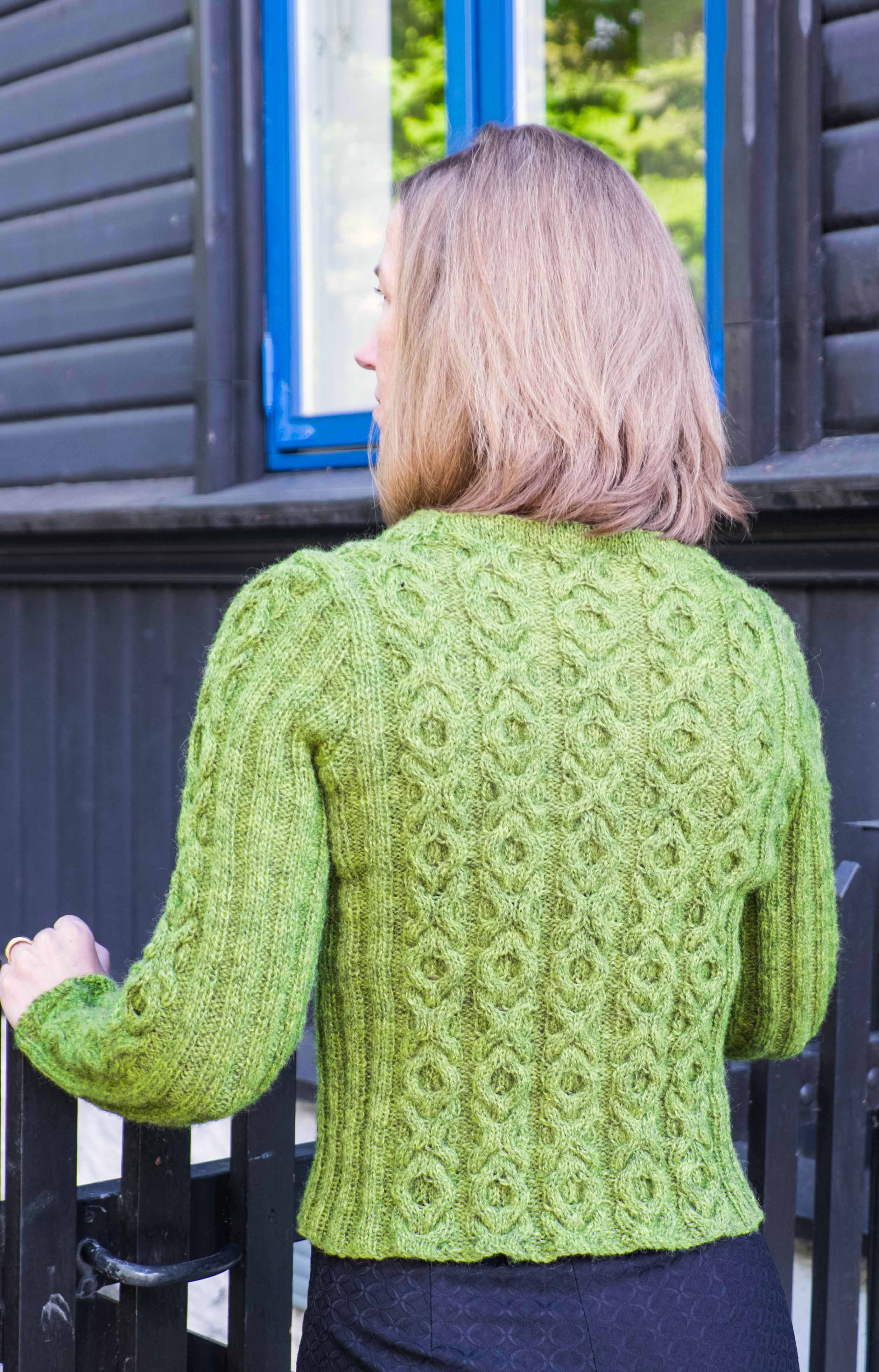 The vivid lime green in the stunning pelt yarn – Norsk Pelsull – from Hifa intoxicated me. I discovered that cross cables with round cables in the middle made a gorgeous texture. By framing the cables with a rib, the sweater becomes figure hugging and is the perfect accompaniment to your favorite jeans or trousers. It ends with a squarish narrow neckband and you can choose if you want to add the matching cowl.
