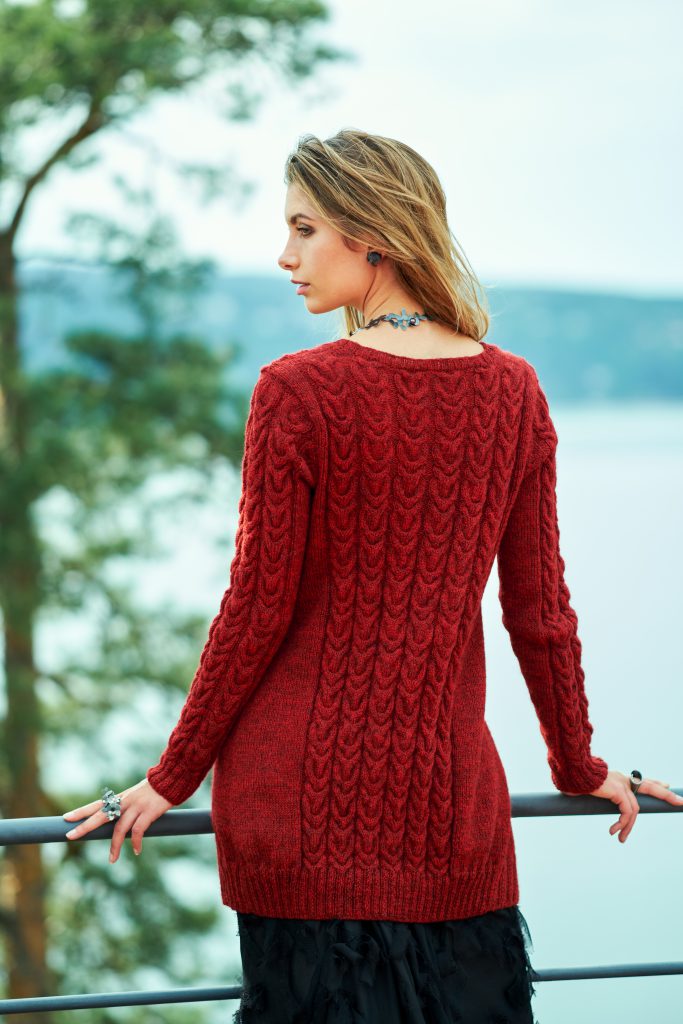 My design Beckside, is a classic cabled sweater initially named after the ruins in Hawkside, with basket cables adorning the center front and back, framed by a braid on each side. Stockinette stitch fills the background to allow the cables to shine. A saddle shoulder allows the center sleeve cable to continue to the neck. The pullover is knitted in the new and lovely tweed yarn Arranmore Light using 3.75 mm/US in Orla, the same deep bright orange as I worked my swatch in and comes in 6 sizes.