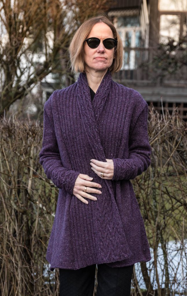 The pullover is worked back and forth in separate pieces and seamed. There are two mirrored cable panels on back and front but only one on the sleeve. Increases in to the center seed stitch panel move the cable panels on the body towards the shoulders. Accompanying decreases are done in the stockinette sides, in addition to the extra waist shaping. The shoulders are shaped with short row shaping and bound off using a 3-needle bind off. Yes, I do have a very long back.