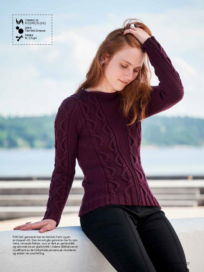 Photographer Eivind Røhne brilliantly captured all these photos of Em. The Free Falling Pullover, first published in English in Interweave Knits Fall 2017 fills the next page, again worn by Em. It is available in sizes XS to 2XL and knitted in Sugar Bush Yarns, Crisp using 4 mm/US 6. The Free Falling Pullover showcases unique and wandering cables, feminine shaping, and casual appeal. This fitted pullover has two traveling central cables that are divided by seed stitch and framed by stockinette stitch on the sides. The boatneck is modified by the short-row shaping on the shoulder and ends in an I-cord bind-off. The pattern is available in English on Ravelry and Loveknitting.