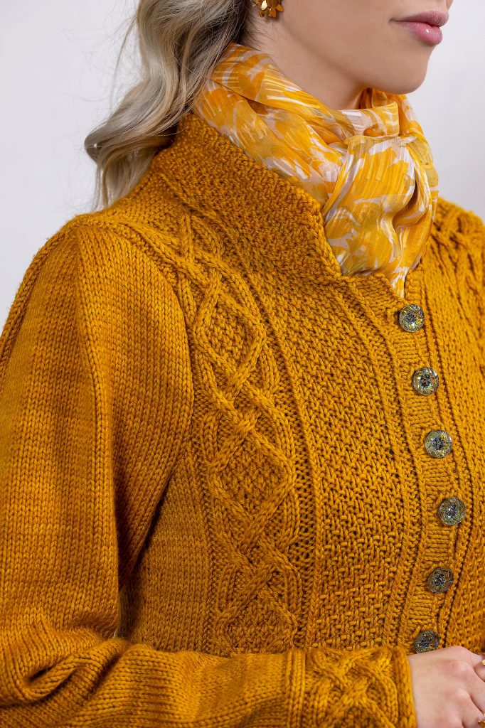 Adeline’s Cardigan is a stunning feast for the eyes. The generous peplum is worked sideways in three pieces. Stitches are picked up from the top of the peplum, turning the sides into asymmetrical wings. The cardigan has Gothic inspired features such as a standing collar, fitted waist and puffed sleeves. The back and fronts are worked from the bottom up with framed moss stitch panels in the sides for textural opulence. Captivating cables abound in this piece with contrasting stockinette sleeves that end in pleats.