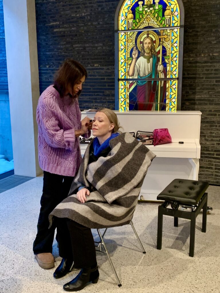 Make-up & Hair Stylist Hina Suleman worked on Anette’s style, while I prepared the designs for her to wear. The chapel was quite cold, so the felted blanket I had brought came in handy and was used both by Anette and Hina. The stained glass windows from the 19th century originally belonged in Gamle Aker church, but were removed during a restoration in the 1950s. How can they be lit artificially instead of by daylight, was the commission given to Nyfelt og Strand Interior Architects.