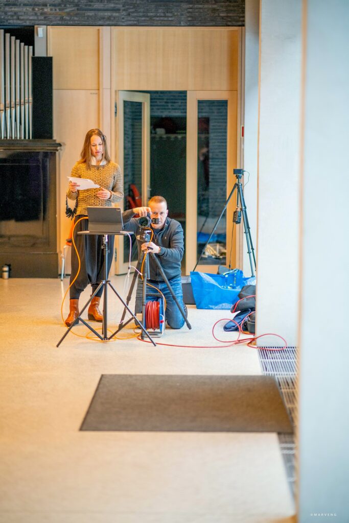 Outside the window you can glimpse the snow in the open courtyard in the photo further up, where we photographed in October back in 2017. This time we stayed inside and used the corner next to the window as our second backdrop. The chapel has a magnificent high ceiling and is another gem inside Bøler kirke. Here I am trying to capture the size of it. Michael’s camera on the stand is recording a video that will be available to my patrons only.