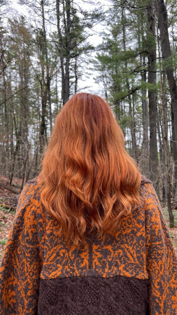 My gorgeous friend Rebekah Audic is wearing the Season of Darkness and Winter Light by Margaretha Finseth, knitted by me, photographed by her husband Gael – who sent these photos to me with the headline; Forest ambers.