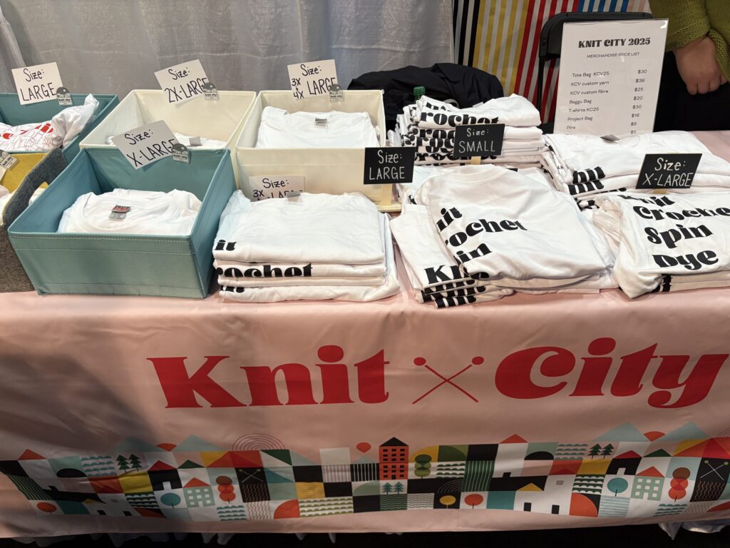 T-shirts, project bags and sweatshirts with Knit City on were for sale at the organisers stand. You can also find them on sale online.