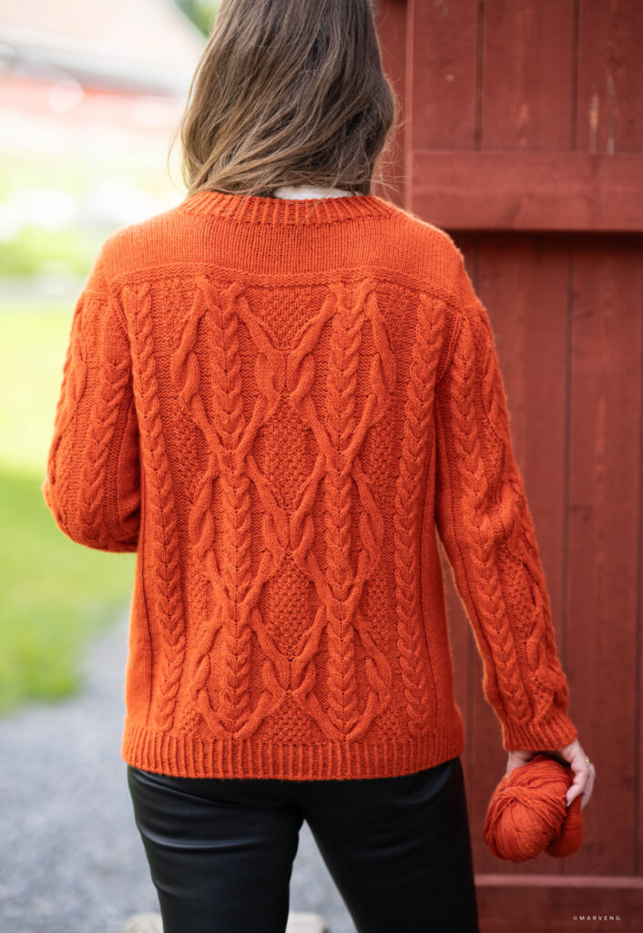 Here is my introduction to the pattern: Kaen – Japanese for flower garden – is a top down seamless pullover adorned with blooming cables and a set-in sleeve. The large cable is framed by a small cable and a reversible stockinette stitch stripe around the round neck that ends in a twisted rib, just like the body. Kaen is knitted in the gorgeous Garna Nobilis – a fine lambswool yarn – held together with Cumulus – an extrafine cashmere and silk mixture.