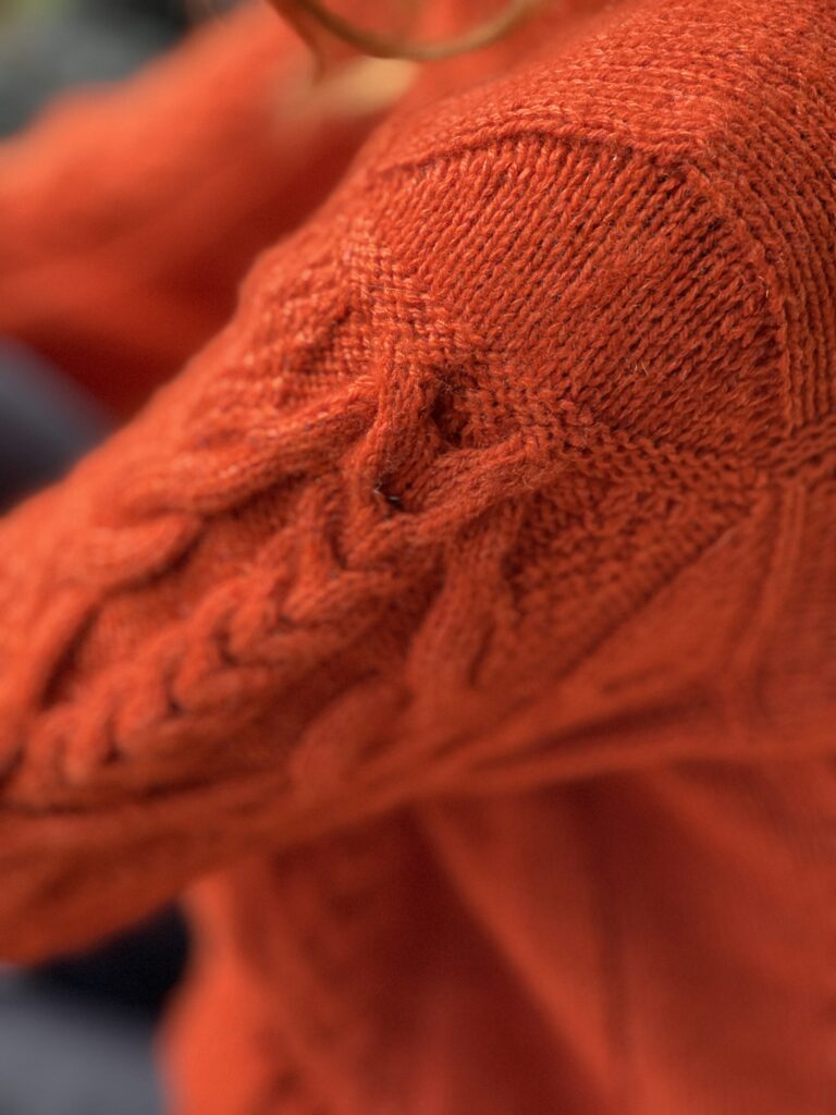 The sweater is worked top-down, from one shoulder, then flat to end of armhole, before joining and working the body in the round to final bind off. The sleeves are worked top down with short rows for the cap and then worked in the round to final bind off. Both body and sleeves have a fake seam stitch. The neck band is worked at the end. All twisted rib bands end in a tubular bind off.