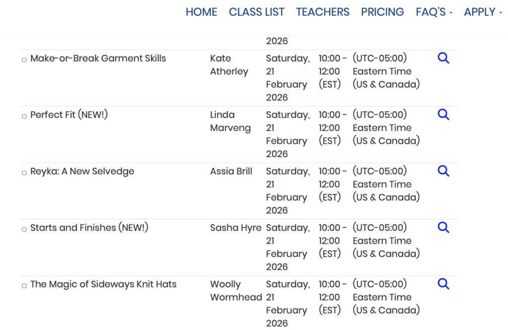 The classes chosen are: Perfect Fit on Saturday 21 February 10 to 12 EST and Smart Knitting Techniques on Sunday 22 February 10 to 12 EST.