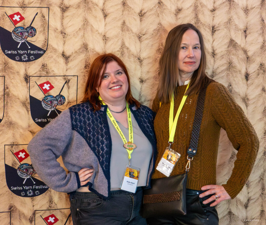 My lunch gang was Aleks Byrd and Julie Dubreux as we have met at several other festivals earlier. The Swiss Yarn Festival provided a lunch bag for us and volunteer Madeline locked us into classroom so we had some privacy during our lunch. It was wonderful for us to catch up! Michael captured Aleks and me at her Meet & Greet on Saturday afternoon. I am wearing my Arine, made in the gorgeous mYak Baby Yak Medium